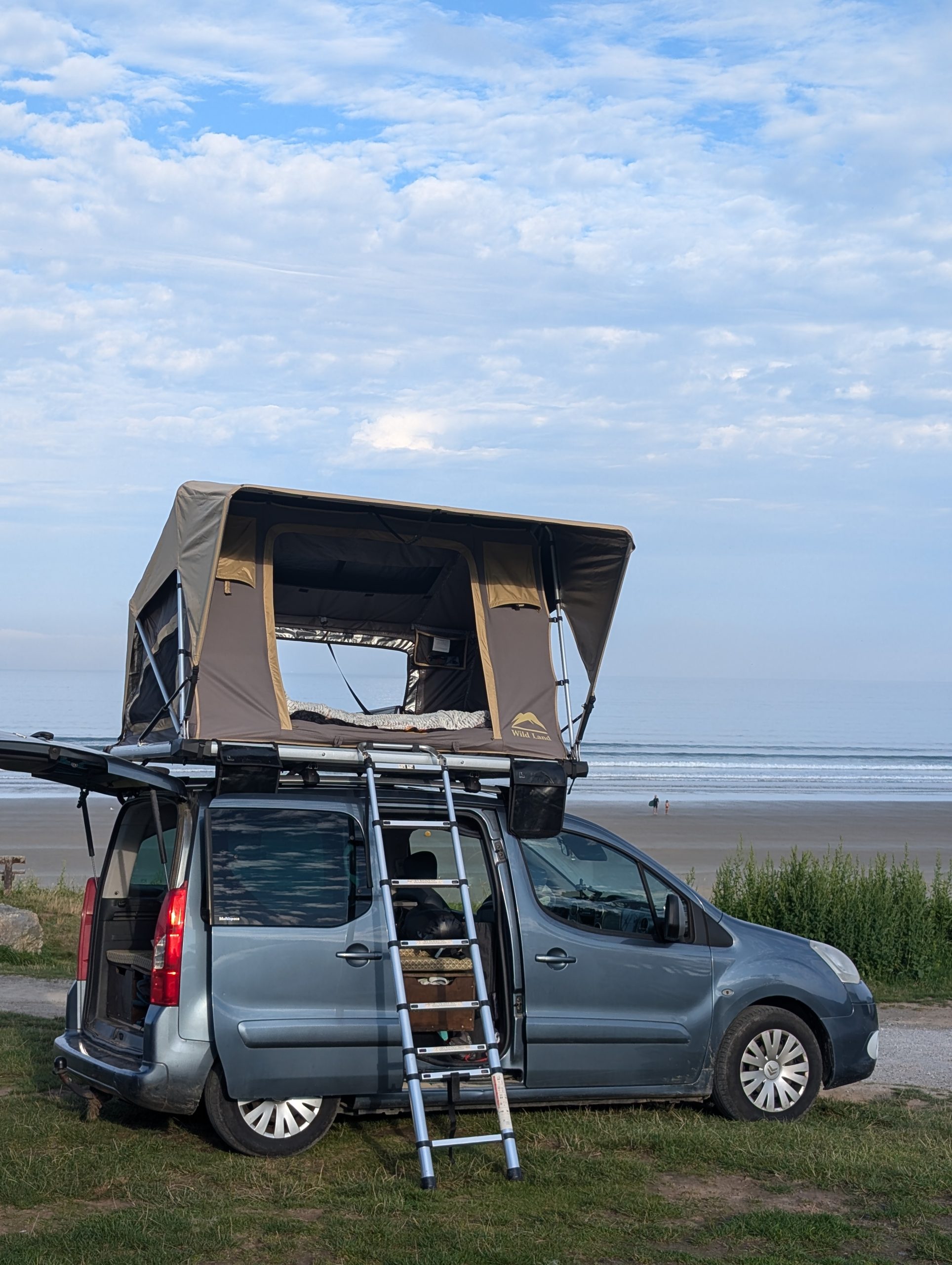 Le Berlingo s’est imposé comme le meilleur compromis prix/espace pour un petit aménagement. Et pour la partie couchage, la décision était prise : ce serait une tente de toit.